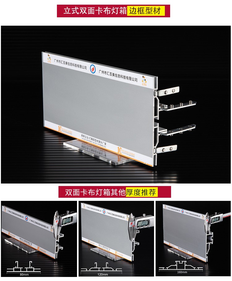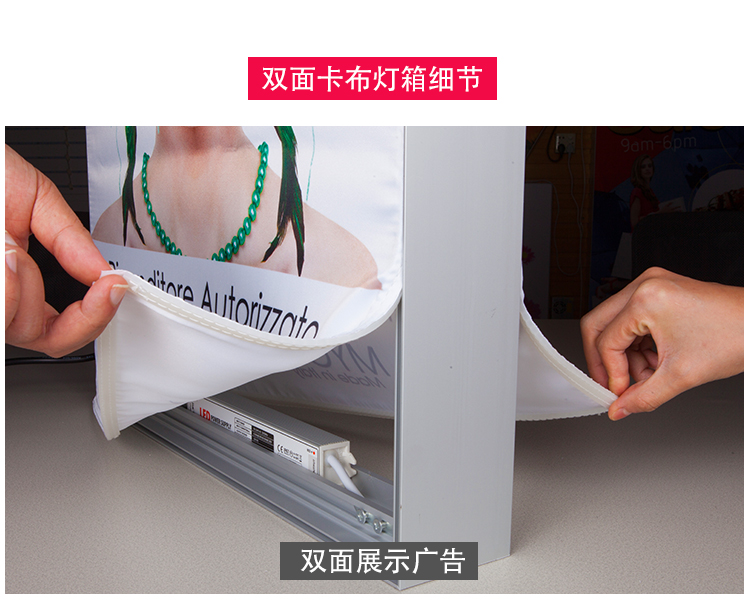 產品簡介:120mm雙面卡布燈箱,一個燈箱,兩個廣告,充分利用空間,廣告效益擴大化!常應用于展覽展會/營業(yè)店面雙面櫥窗展示廣告,無邊框設計可以更全面展示廣告,無視覺阻礙觀看。...