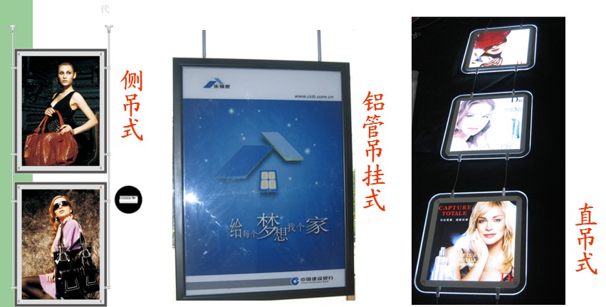 吊掛燈箱的展示方式有單面展示和雙面展示的兩種形式,吊掛燈箱按材料分水晶吊掛燈箱、鋁材吊掛燈箱兩種形式。