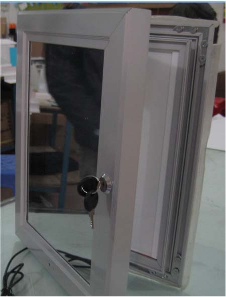感應(yīng)燈箱的制作跟水晶燈箱類似,主要區(qū)別是此款燈箱的面板采用的是半透鏡的面板,而且在燈箱內(nèi)安裝了一個感應(yīng)器,所以感應(yīng)燈箱的結(jié)構(gòu)(如下圖)也有所不同感應(yīng)器燈箱的主要性能是可以以兩種形態(tài)存在(人在時鏡子,人遠離時是廣告畫面).